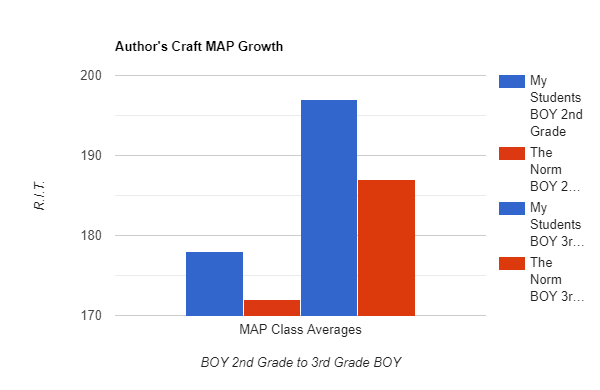 Of the 15 student sample size, they averaged 178 on the Author’s Craft area of MAP Growth at the BOY 2019-2020, which are the 4th level comprehension skills: Theme, Author’s Point of View, Author’s Purpose.