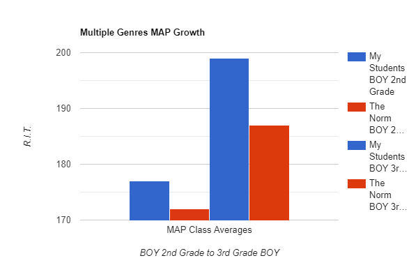 Of the 15 student sample size, they averaged 177 on the Multiple Genres area of MAP Growth at the BOY 2019-2020, which encompasses 1st through 3rd level reading skills such as Plot, Characters and Main Idea.