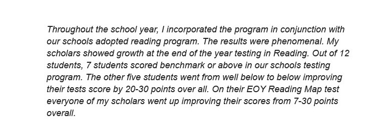 Throughout the school year, I incorporated the program in conjunction with our schools adopted reading program. The results were phenomenal. My scholars showed growth at the end of the year testing in Reading. Out of 12 students, 7 students scored benchmark or above in our schools testing program. The other five students went from well below to below improving their tests score by 20-30 points over all. On their EOY Reading Map test everyone of my scholars went up improving their scores from 7-30 points overall.