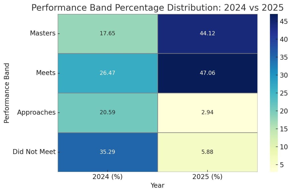 From 2024 to 2025, my students increased their proficiency from 44.12% to 91.18% — more than doubling their performance.